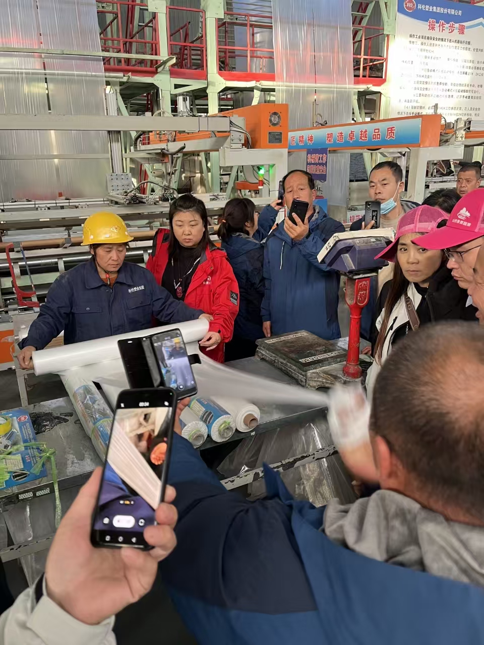 在集團領導和公司銷售、技術人員的帶領下,考察團參觀了功能棚膜車間、地膜車間、技術研發中心、展廳等處。科倫塑業先進的集中棚膜供料設備、智能化地膜自動卷取系統、一流的檢驗檢測儀器受到廣大客商的高度關注和充分肯定。